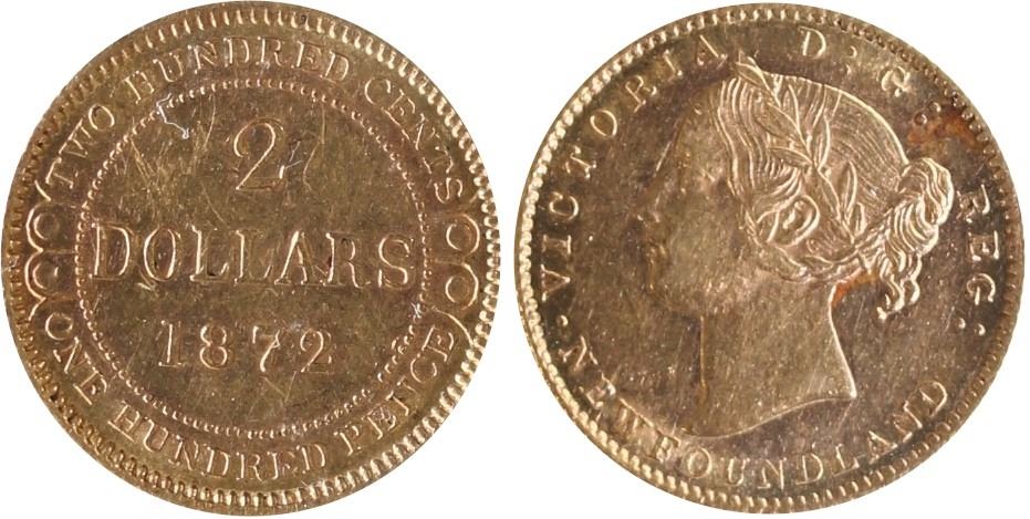 Nfld; 1872 $2 Gold ICCS Choice About Uncirculated-55 Lustrous.