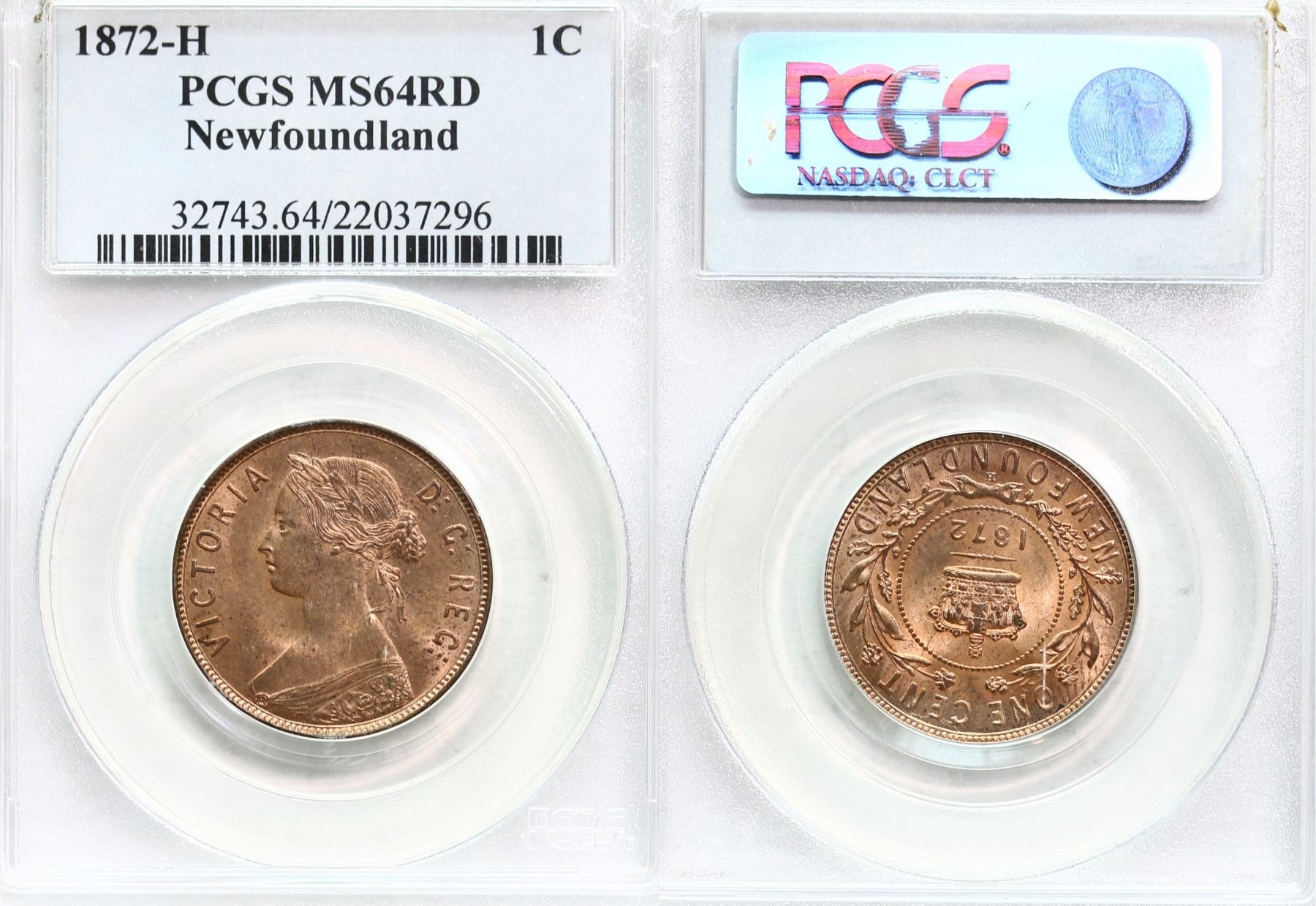 Nfld; 1872H 1¢ PCGS Very Choice Mint State-64 Red - 90% RED lustre. Superb lustrous and attractive issue. Interesting “Die Break” on the reverse at 1 o’clock and several “repunched” letters.