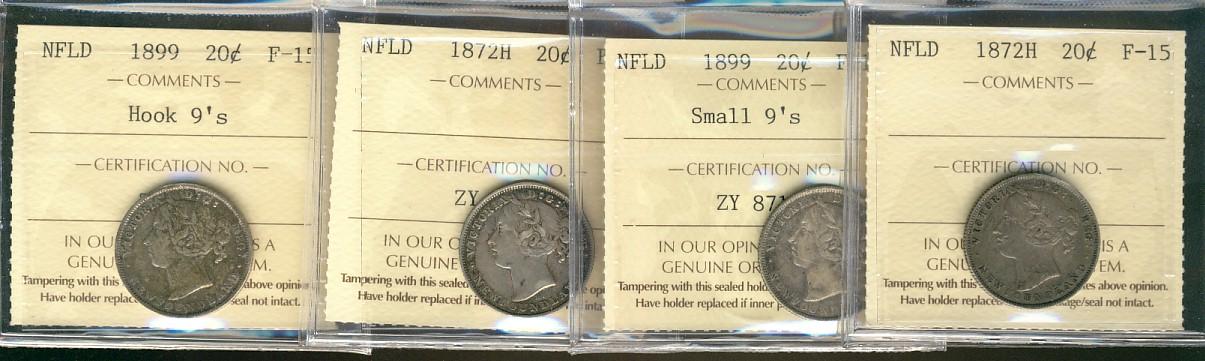 Nfld 1872H 20¢(2), 1899 Hook & Sml 9's ICCS F15. Lot of 4 coins all F15.