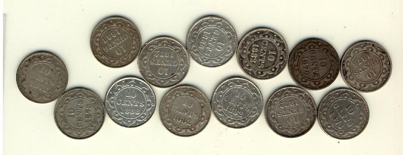 Nfld 1872H(3) 10¢, 1873(2), 1876H(2), 1882H(3) & 1888(3). Lot of 11 coins G+ to Fine+. Should be v