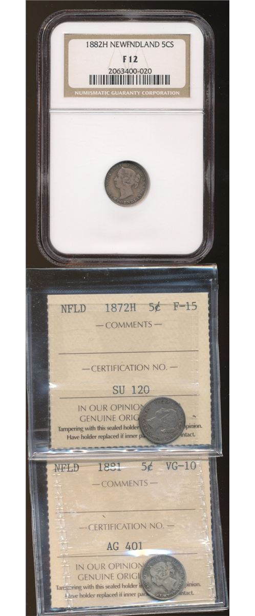 Nfld 1872H 5¢ F15, 1881H VG10 both ICCS graded & 1882H F12 NGC. Lot of 3 coins.