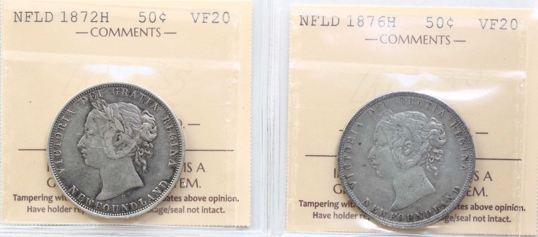 Nfld; 1872H 50¢, 1876H, Both coins ICCS Very Fine-20