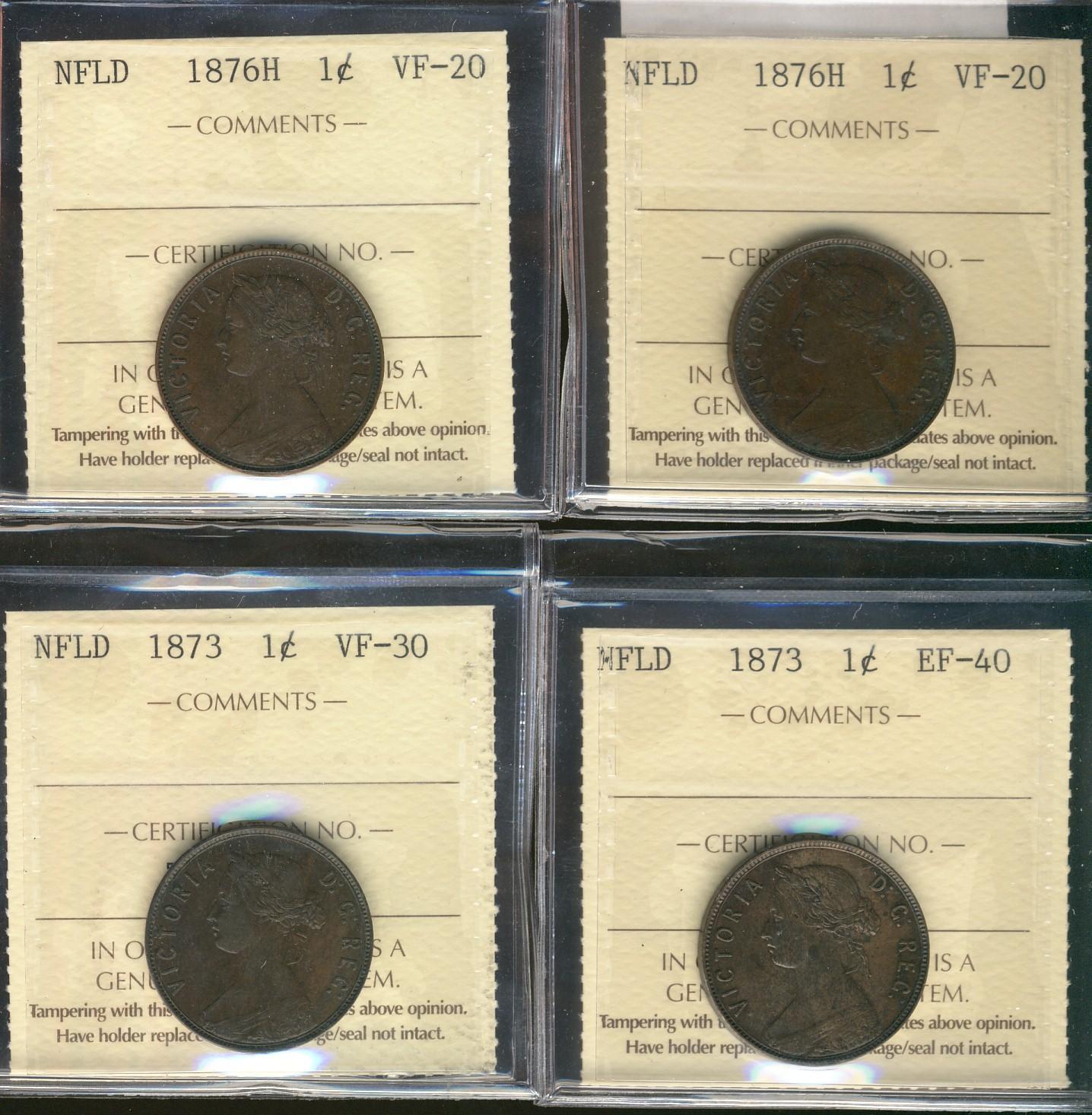 Nfld 1873 1¢ ICCS VF30(2) & 1876H VF20(2). Lot of 4 ICCS graded coins.