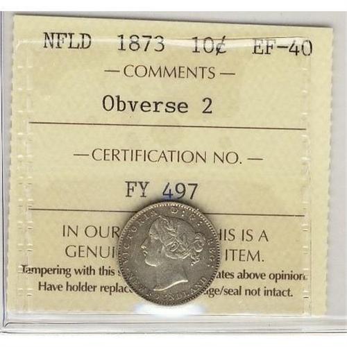Nfld 1873 10¢ Obv 2 ICCS EF40.