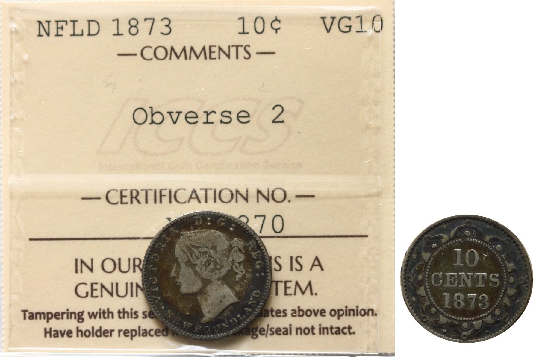 Nfld; 1873 10¢ "Obv.2" ICCS Very Good-10, Rare obverse.