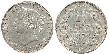 Nfld, 1873 10¢ PCGS AU53, brilliant and lustrous. Scarce date.