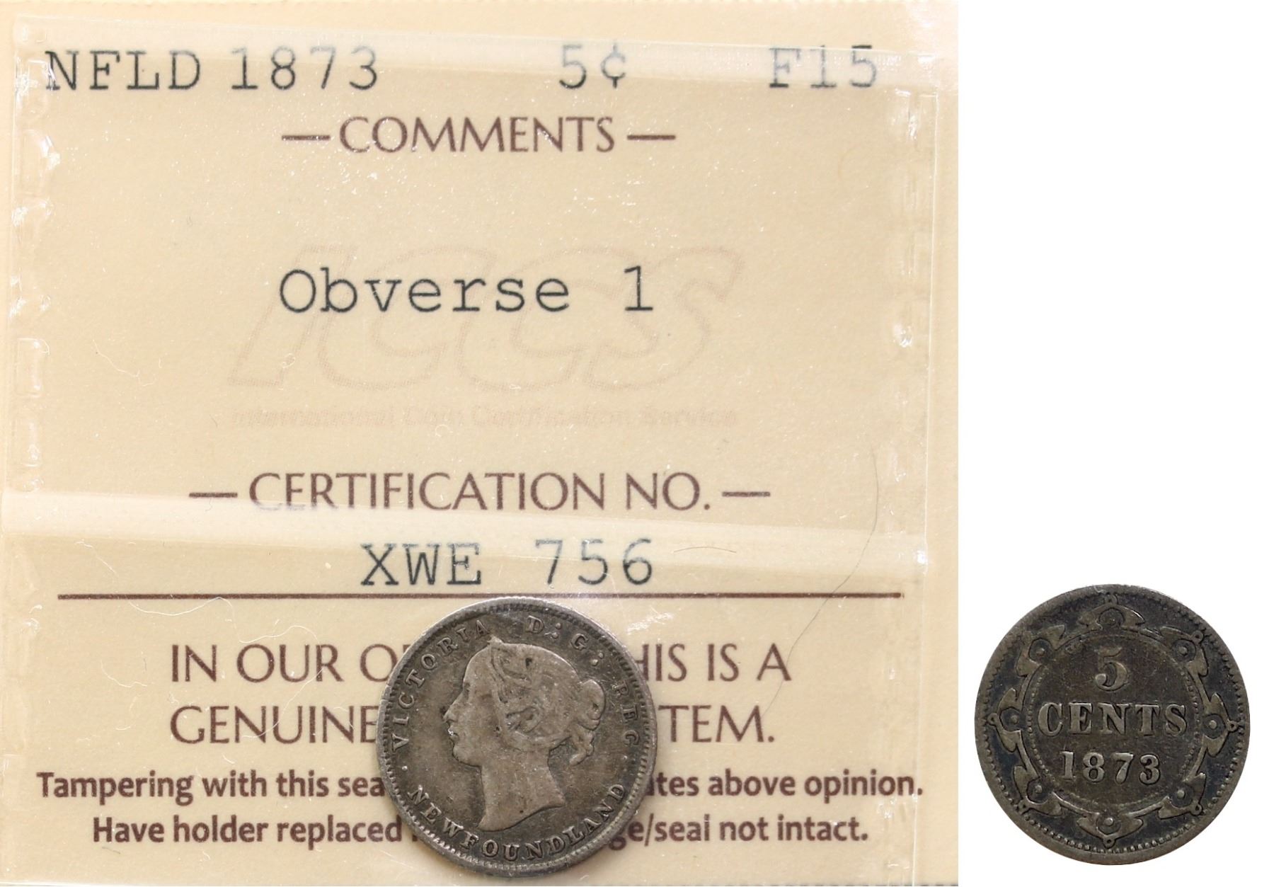 Nfld 1873 5¢ "Obv.1" ICCS Choice Fine-15. Rare obverse type.