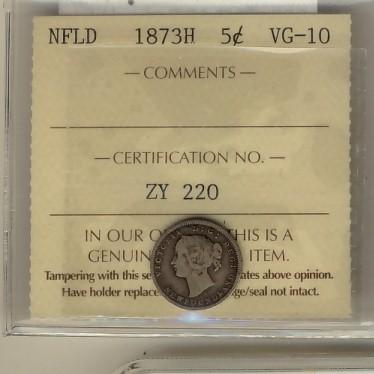 Nfld 1873H 5¢ ICCS VG10. Tough issue to find in any grade.