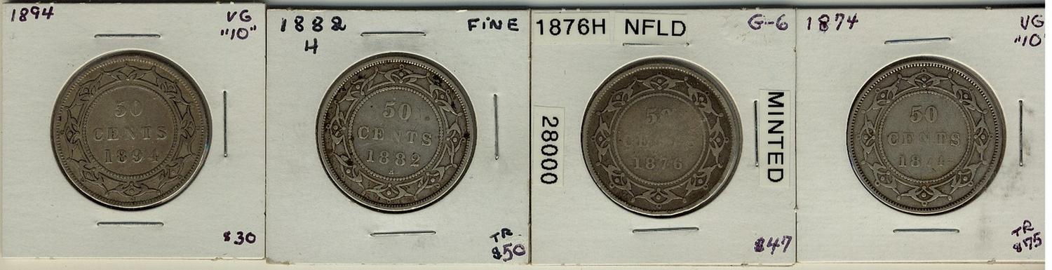 Nfld 1874, 1876H, 1882H & 1894 50¢. Lot of 4 coins Good to Fine.