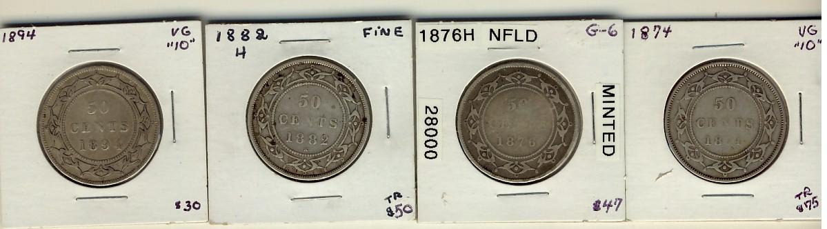 Nfld 1874, 1876H, 1882H & 1894 50¢. Lot of 4 coins Good to Fine.