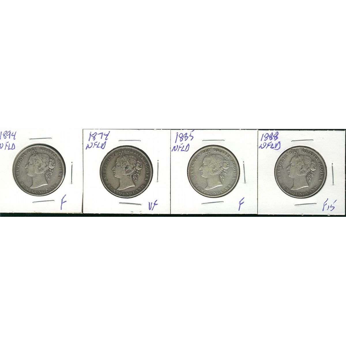 Nfld 1874 50¢, 1885, 1888 & 1894. All Fine to Very Fine. Lot of 4 coins.