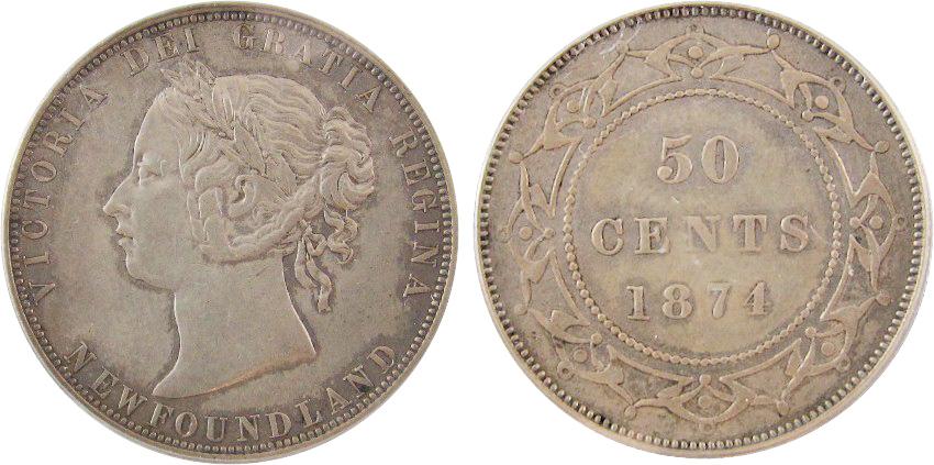 Nfld 1874 50¢ PCGS AU50. Excesively tough in high grades. In old green PCGS holder.