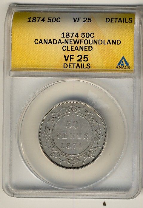 Nfld 1874H 50¢ ANACS VF25 Details. Designated as cleaned.