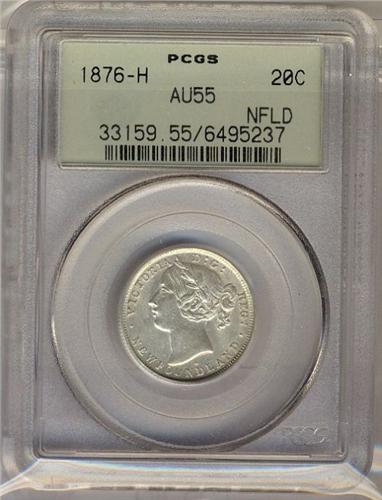 Nfld 1876H 20¢ PCGS AU55,brilliant with lots of lustre. A scarce date.