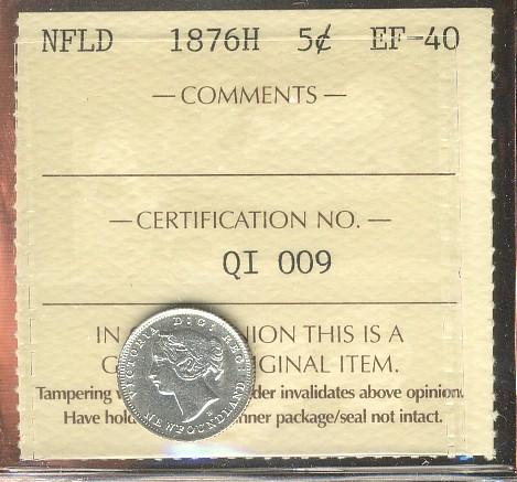 Nfld 1876H 5¢ ICCS EF40. A very tough date to find in this condition.