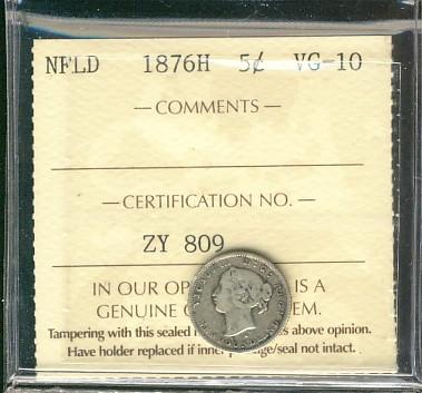 Nfld 1876H 5¢ ICCS VG10. Tough issue to find.