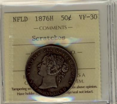Nfld 1876H 50¢ ICCS VF30. Designated with scratch.