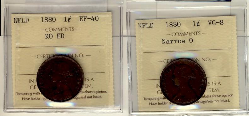 Nfld 1880 1¢ RO ED EF40 & Nar 0 ICCS VG8. Lot of 2 coins.