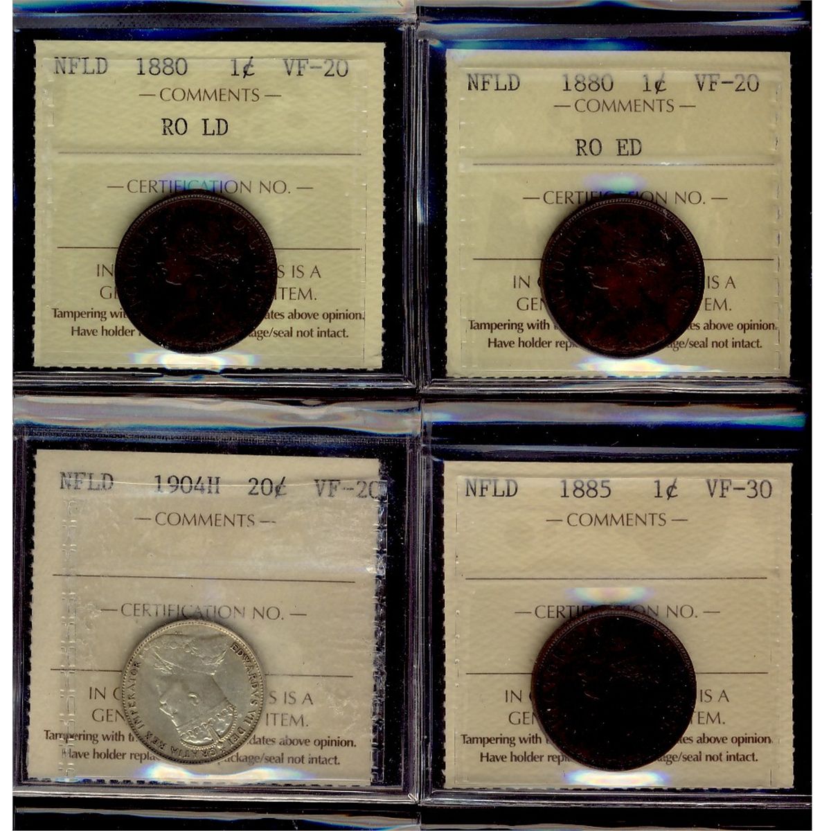 Nfld 1880 1¢ RO ED, RO LD, 1885 VF30 & 20¢ 1904H VF20.