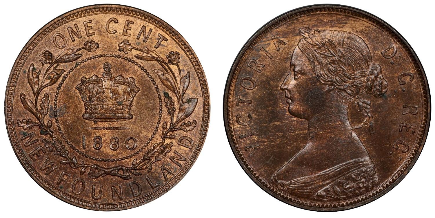 Nfld 1880 1¢ "Round 0, Low 0" PCGS Choice Mint State-64BN. Enticing fully lustrous example displaying bright red highlights.