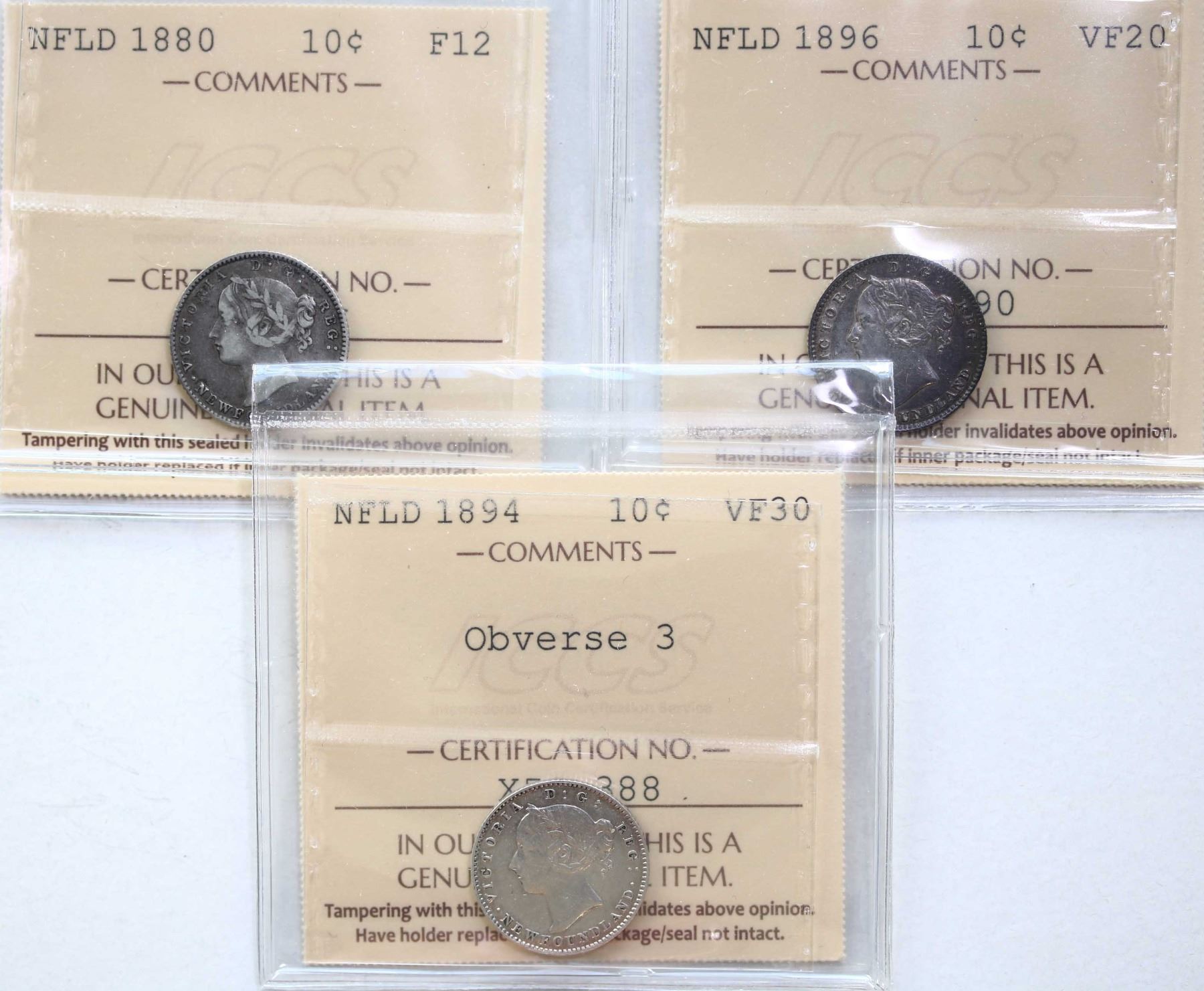Nfld; 1880 10¢, 1894 "Obv.3", 1896, Both coins ICCS Fine-12 to Choice Very Fine-30