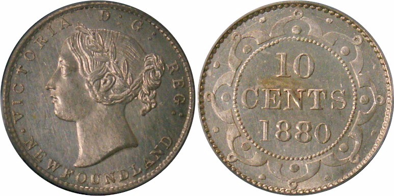 Nfld 1880 10¢ PCGS SP64. Full white with frostlike finish. Excessively scarce and desirable.