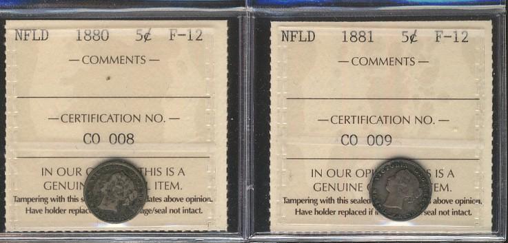 Nfld 1880 & 1881 5¢ ICCS F12. Lot of 2 coins.