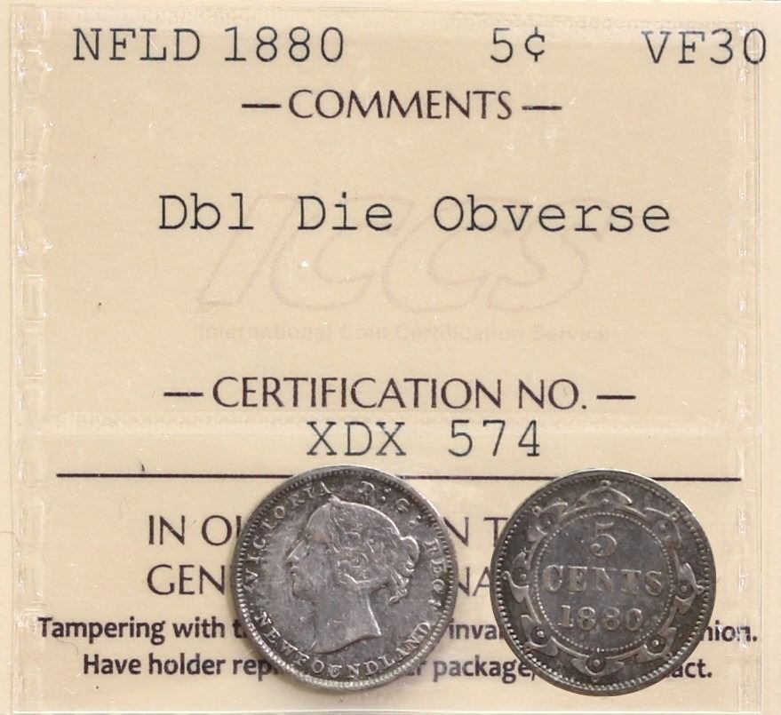 Nfld 1880 5¢ "Dbl Die Obverse" ICCS Choice Very Fine-30. Very scarce variety.
