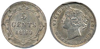 Nfld 1880 5¢ PCGS AU58. Nice example with lustre.