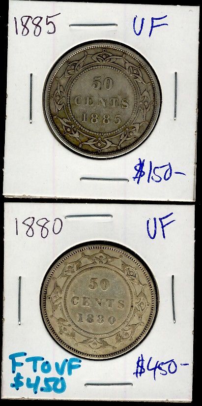 Nfld 1880 50¢ & 1885. Lot of 2 coins F to VF.