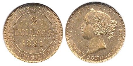 Nfld 1881 $2 Gold NGC AU58.
