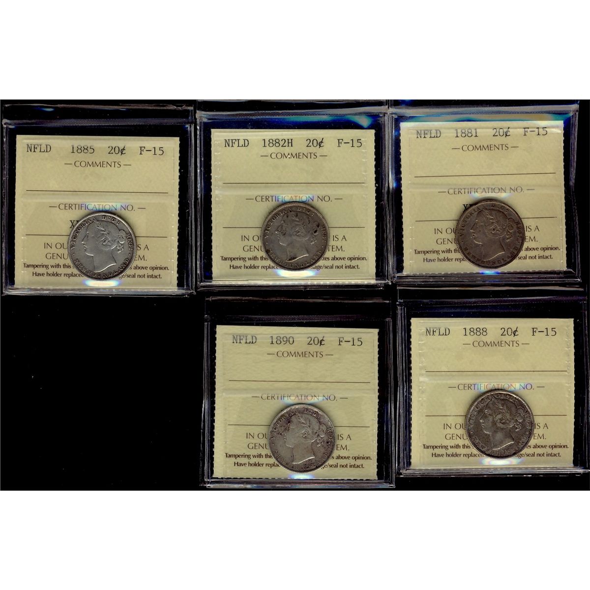 Nfld 1881 20¢, 1882H, 1885, 1888 & 1890 ICCS F15. Lot of 5 coins.