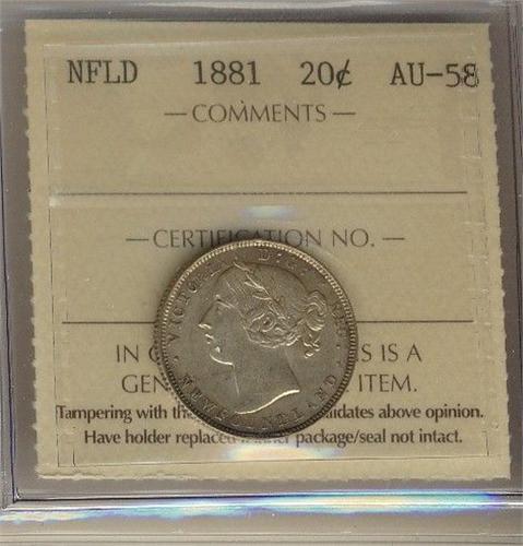 Nfld 1881 20¢ ICCS AU58PQ,brilliant with lots of lustre. A scarce date. Fourth best known!
