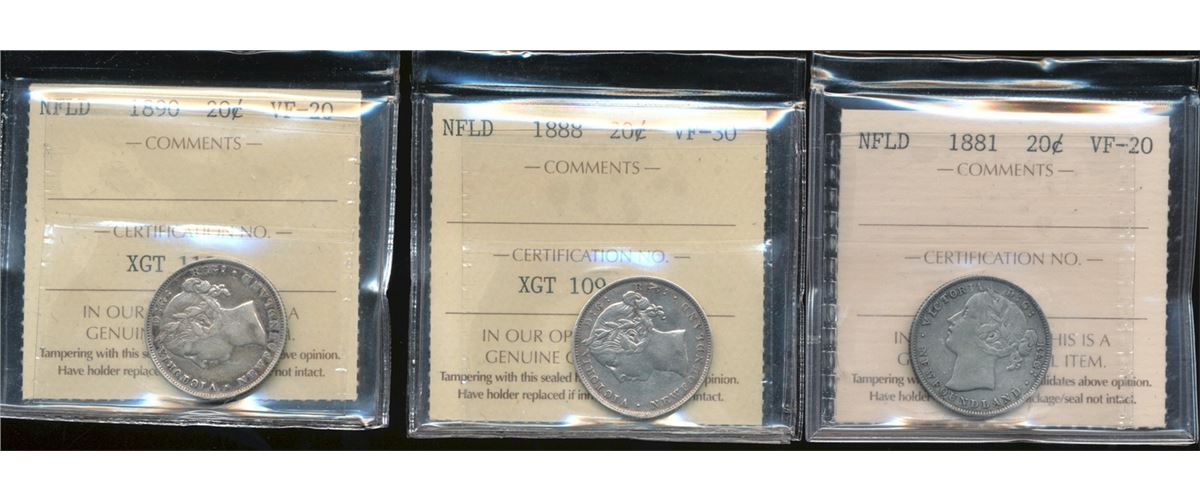 Nfld 1881 20¢ VF20, 1888 VF30, 1890 VF20. All with light tone. Lot of 3 ICCS coins.