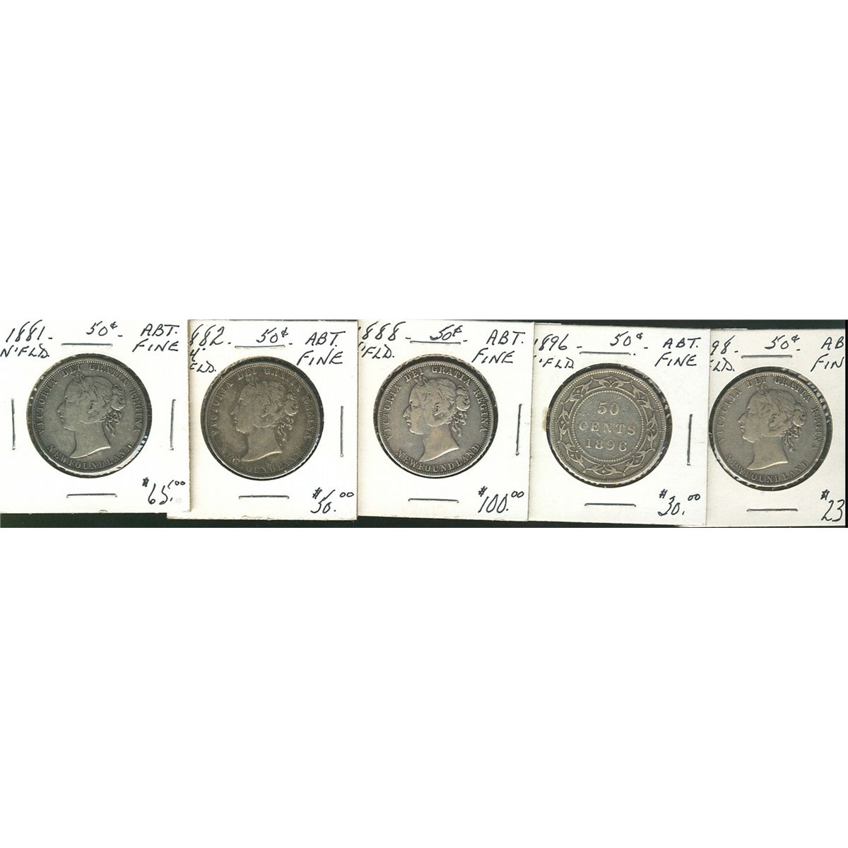 Nfld 1881 50¢, 1882H, 1888, 1896 & 1898. Lot of 5 coins all Abt Fine. (PBA).