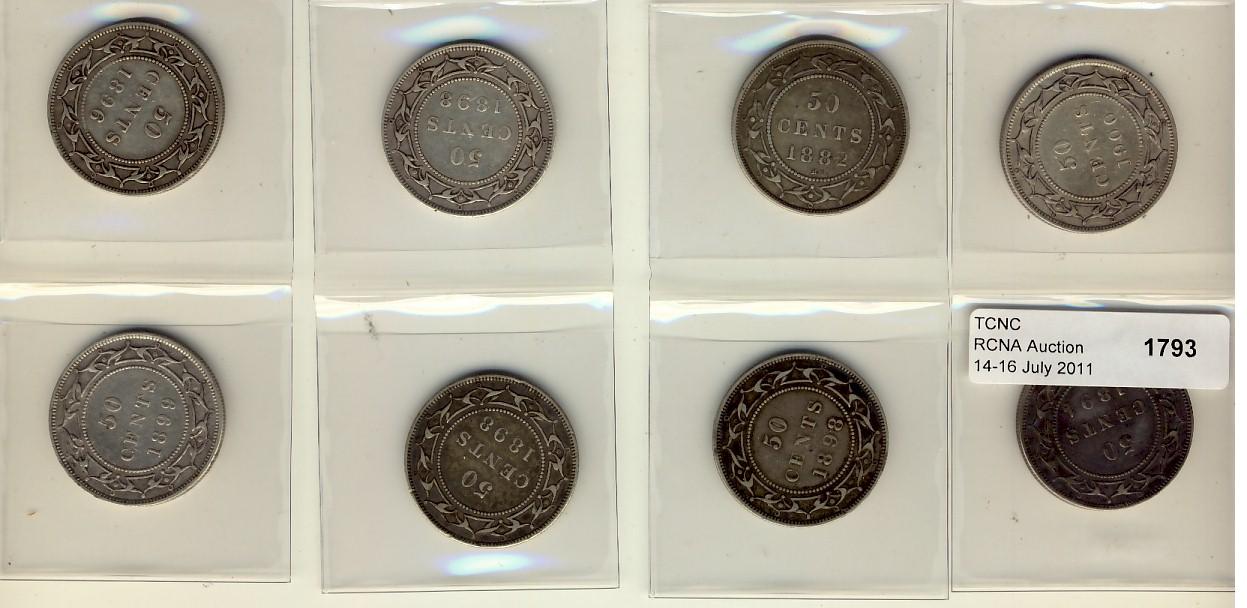 Nfld 1882H, 1894 50¢, 1896, 1898(3) 3 types, 1899 N9's & 1900. Lot of 8 coins all VF or better. Should be viewed.