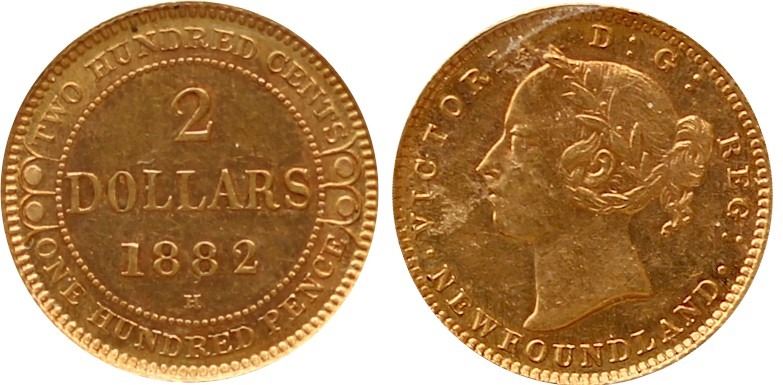 Nfld 1882H $2 Gold ICCS Choice About Uncirculated-55 HIghly lustrous for grade.