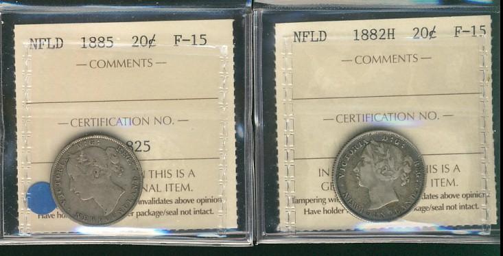 Nfld 1882H 20¢ & 1885 ICCS F15. Lot of 2 coins.
