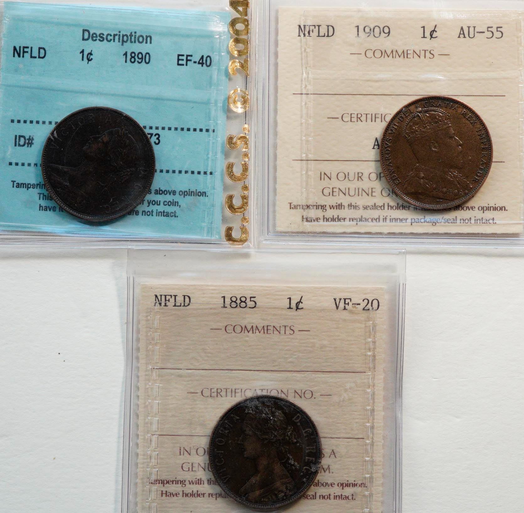 Nfld 1885 1¢, 1890, 1909. Lot of 3 coins certified Very Fine-20 to Choice About Uncirculated-55