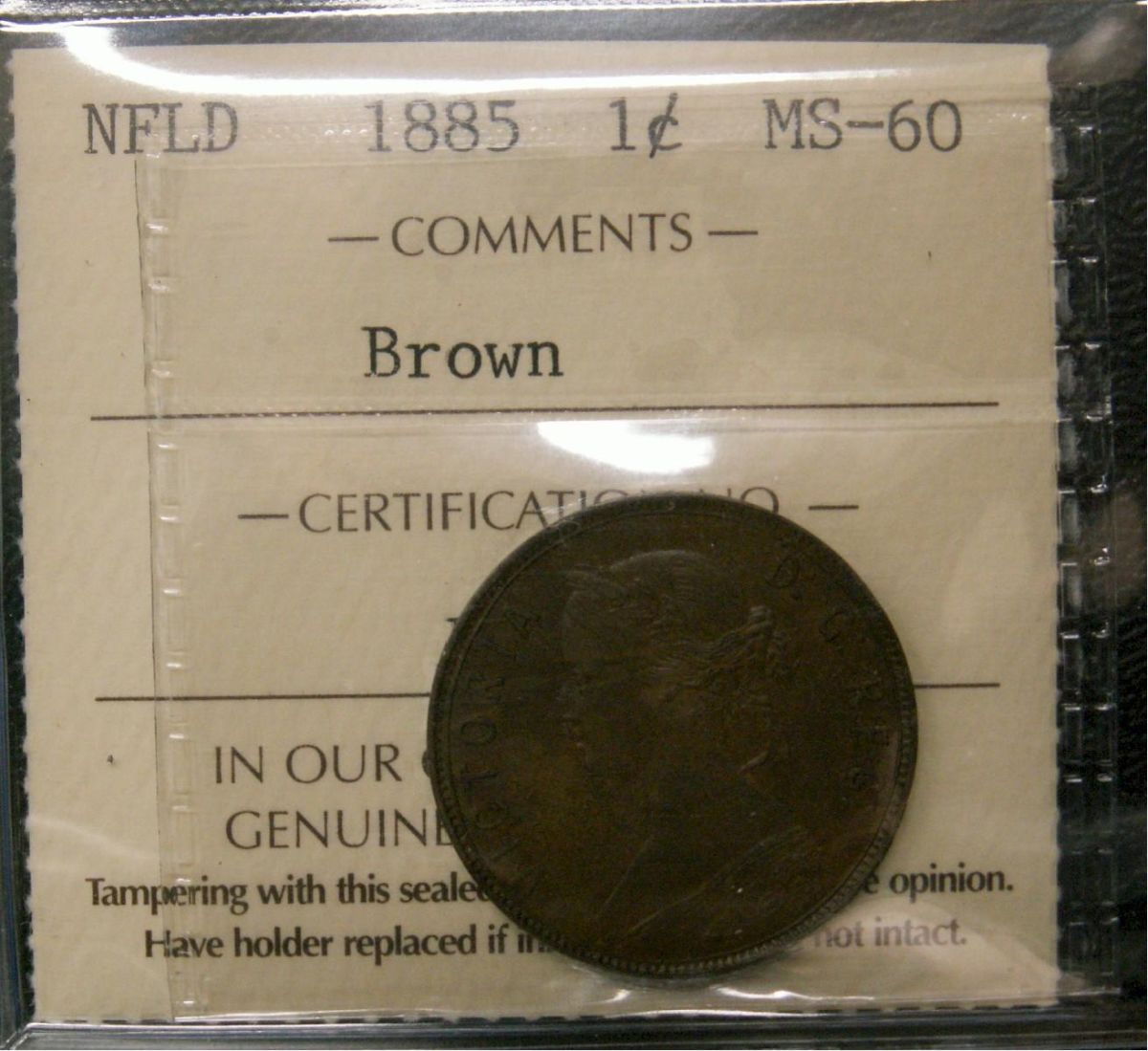 Nfld 1885 1¢ ICCS MS-60, nice chocolate brown example. Scarce in this designation