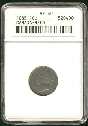 Nfld 1885 10¢ ANACS VF30. Darkish shades with nice strike.