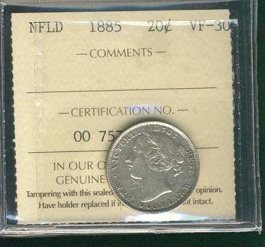 Nfld 1885 20¢ ICCS VF30. Key example.