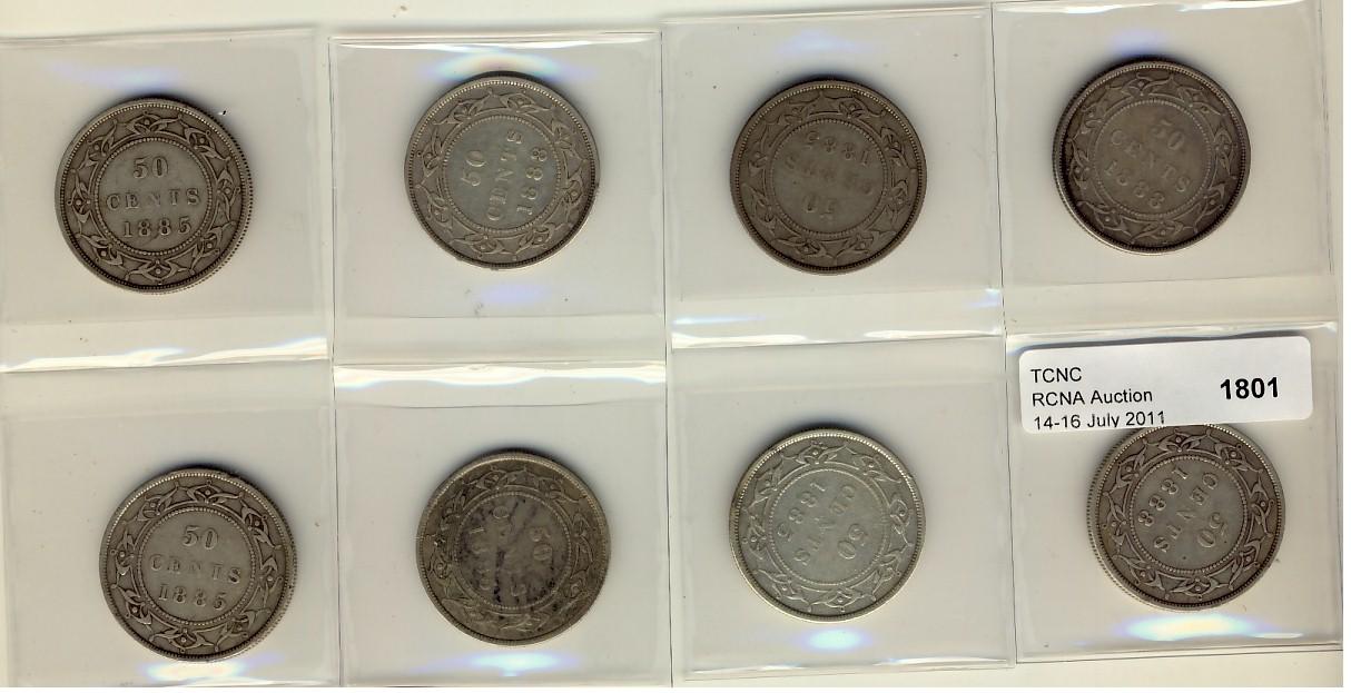 Nfld 1885(5) & 1888(3) 50¢. Lot of 8 coins all VG to Fine. Should be viewed.