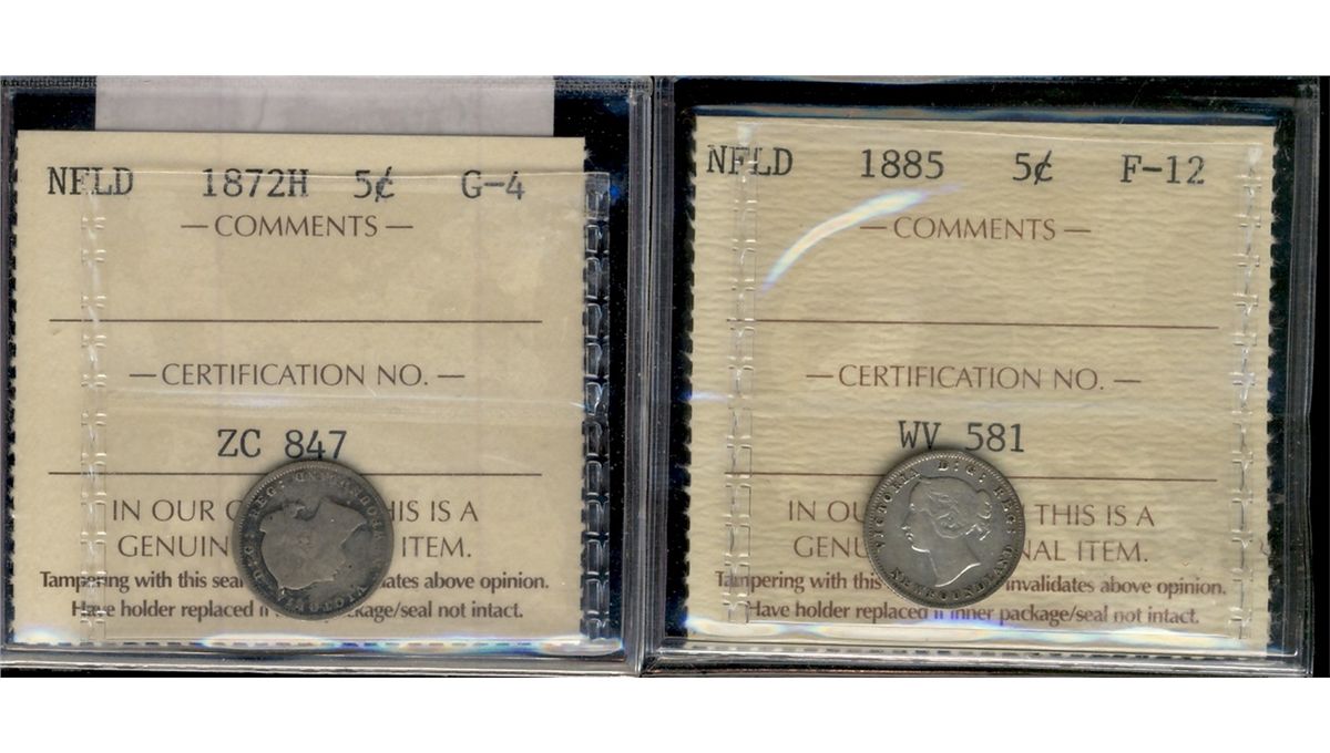 Nfld 1885 5¢ F12 & 1872H G4. Lot of 2 coins both ICCS graded.