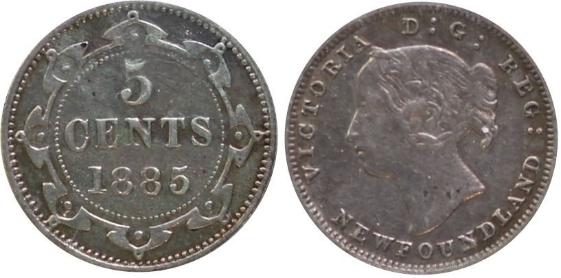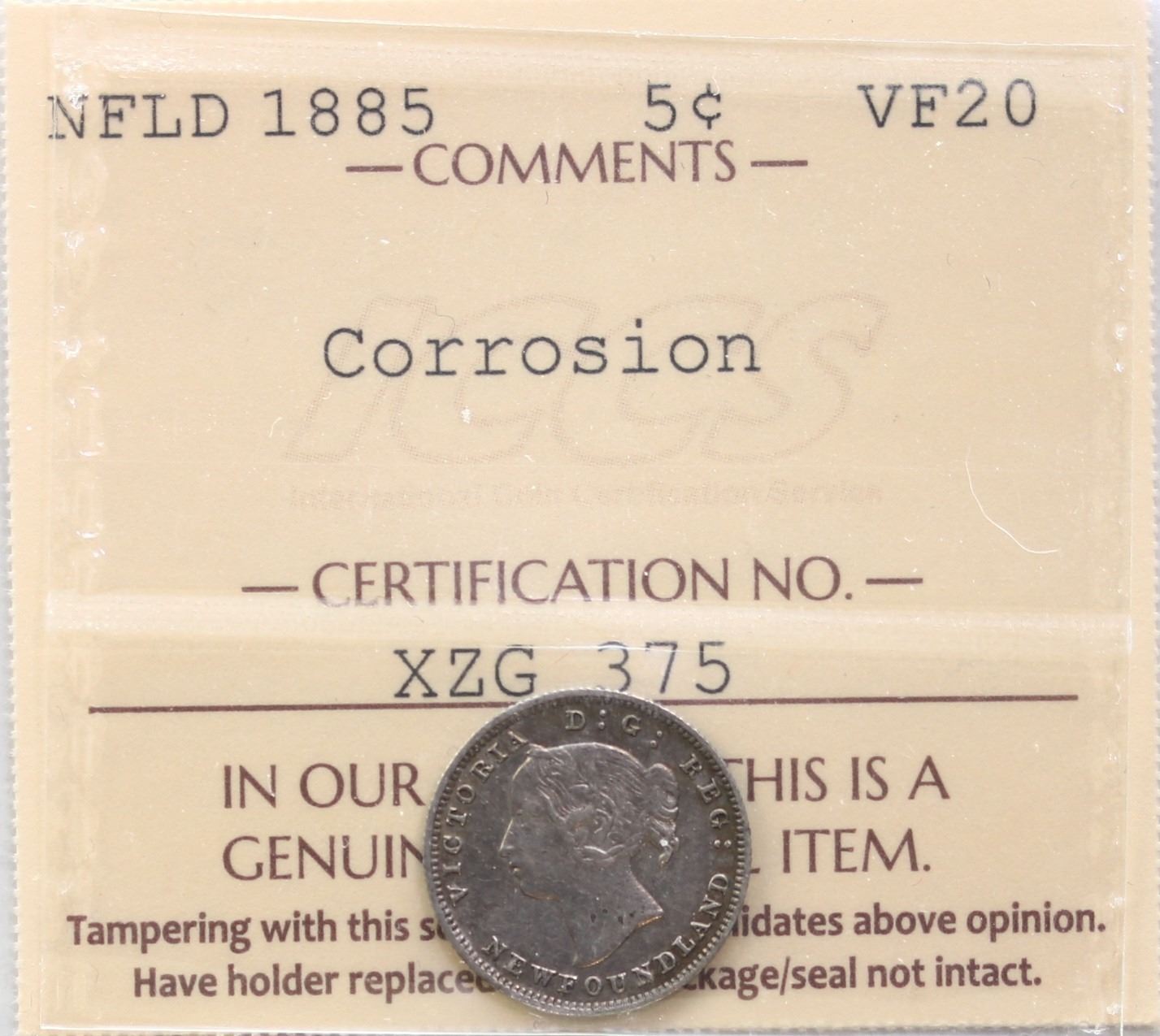 Nfld; 1885 5¢ ICCS Very Fine-20, very light corrosion. Still a nice example.