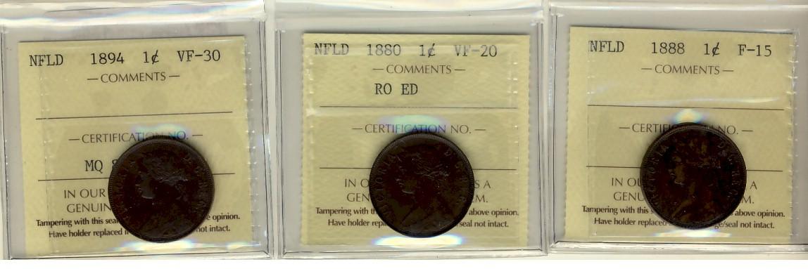Nfld 1888 1¢ F15, 1880 RO ED VF20 & 1894 VF30. Lot of 3 ICCS graded cents.
