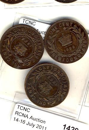 Nfld 1888 1¢. Lot of 3 coins in Fine condition.