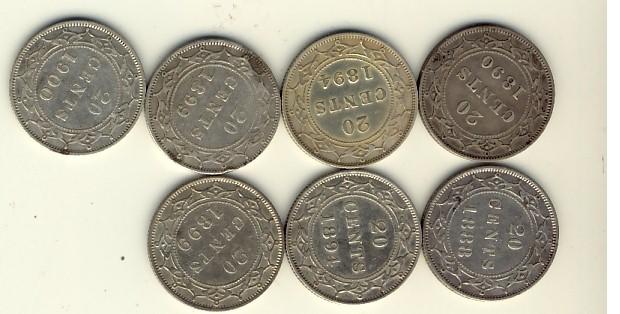 Nfld 1888 20¢, 1890, 1894 Obv 1, Obv 2, 1899 Hook, Large & 1900. Lot of 7 coins all VF or better. Should be viewed.