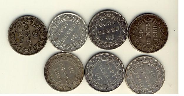 Nfld 1888 20¢, 1890, 1894 Obv 1, Obv 2, 1899 Hook, Large & 1900. Lot of 7 coins all VF or better. Should be viewed.