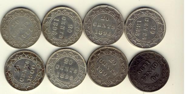 Nfld 1888 20¢, 1890, 1894 Obv1, Obv2, 1896 Lg6, Sm6, 1899 Lg & 1900. Lot of 8 coins all VF or bette